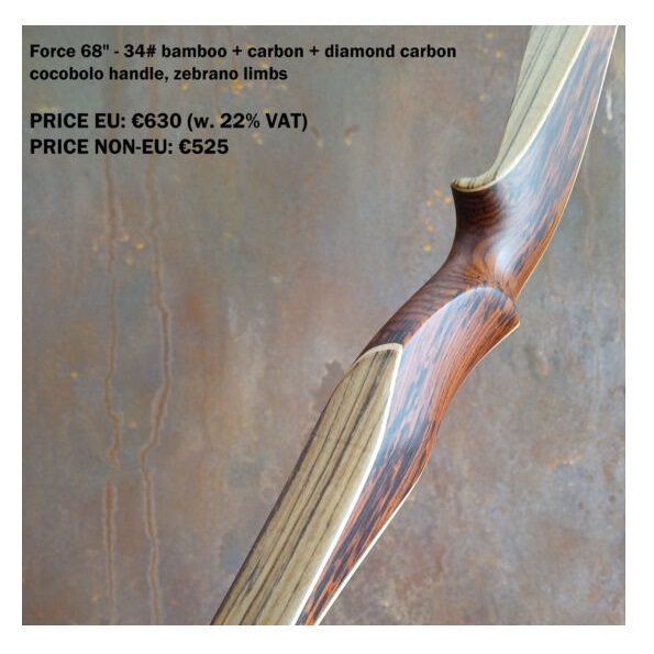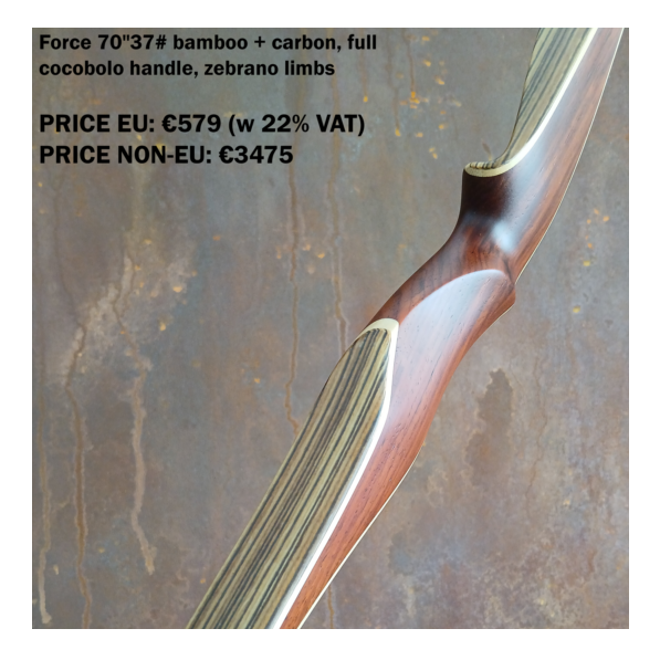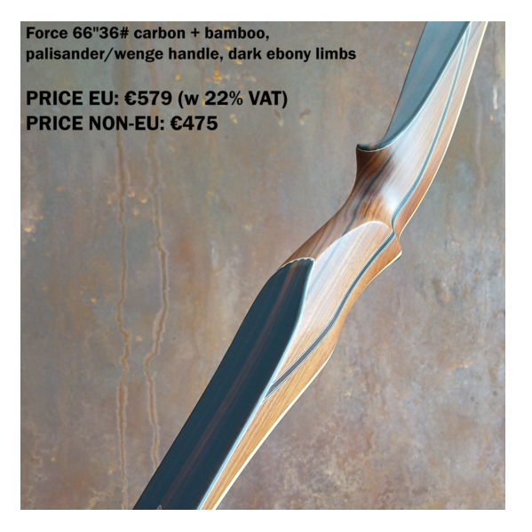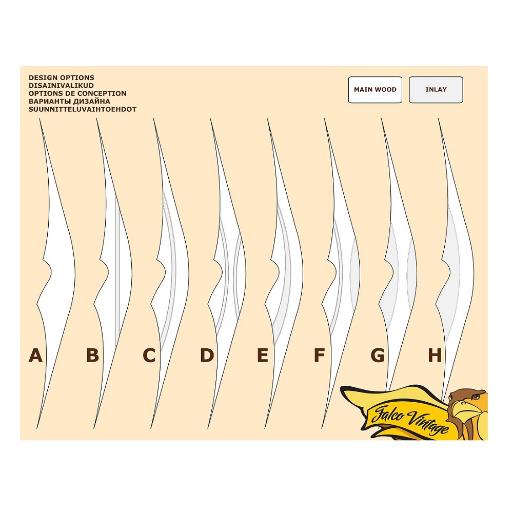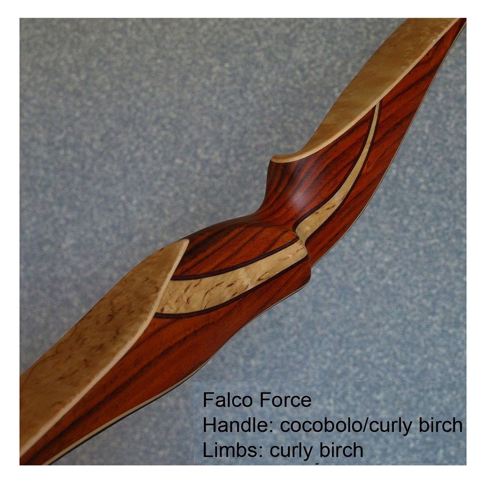 The Falco flagship model Force Vintage is a top performance competition longbow which packs excellent speed and stability into a sleek well-balanced design. The bow features a radical reflex-deflex profile that is further emphasized by a special forward-leaning riser. To make an already quick bow even faster, each Force Vintage comes with a default one layer of carbon, which can be extended to up to three layers (for custom orders). The unique riser design also features Falco signature high wrist grip. The Force Vintage model is a choice for many top archers worldwide for its excellent speed, flexible draw cycle and sleek design, which takes use of ethically harvested exotic woods. It is a definite performance winner in its price category, coming often ahead of much more expensive top models from other manufacturers.